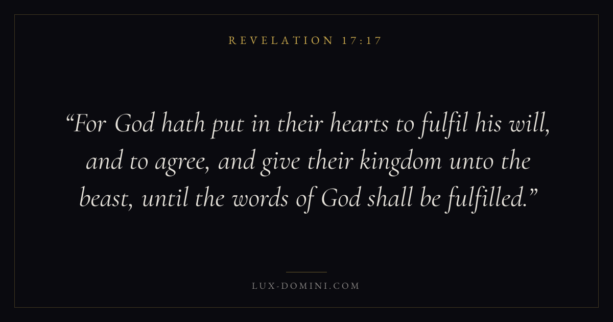 For God hath put in their hearts to fulfil his will, and to agree, and give their kingdom unto the beast, until the words of God shall be fulfilled.