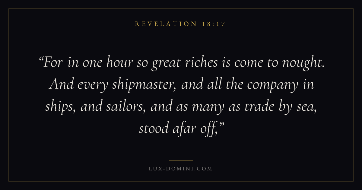 For in one hour so great riches is come to nought. And every shipmaster, and all the company in ships, and sailors, and as many as trade by sea, stood afar off,