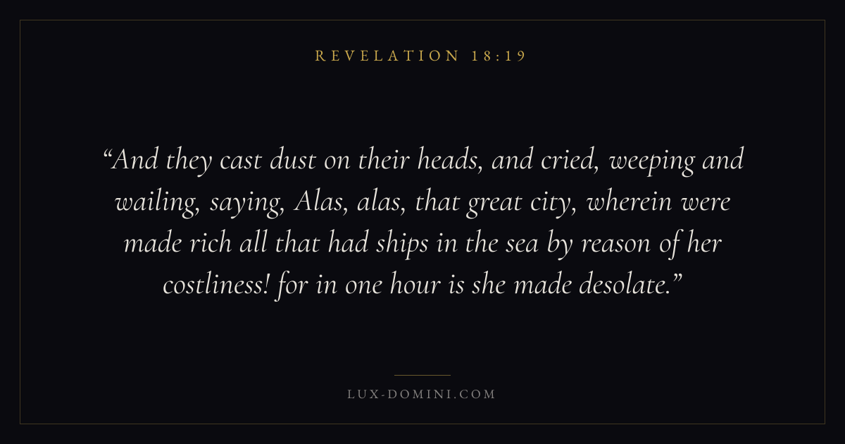 And they cast dust on their heads, and cried, weeping and wailing, saying, Alas, alas, that great city, wherein were made rich all that had ships in the sea by reason of her costliness! for in one hour is she made desolate.