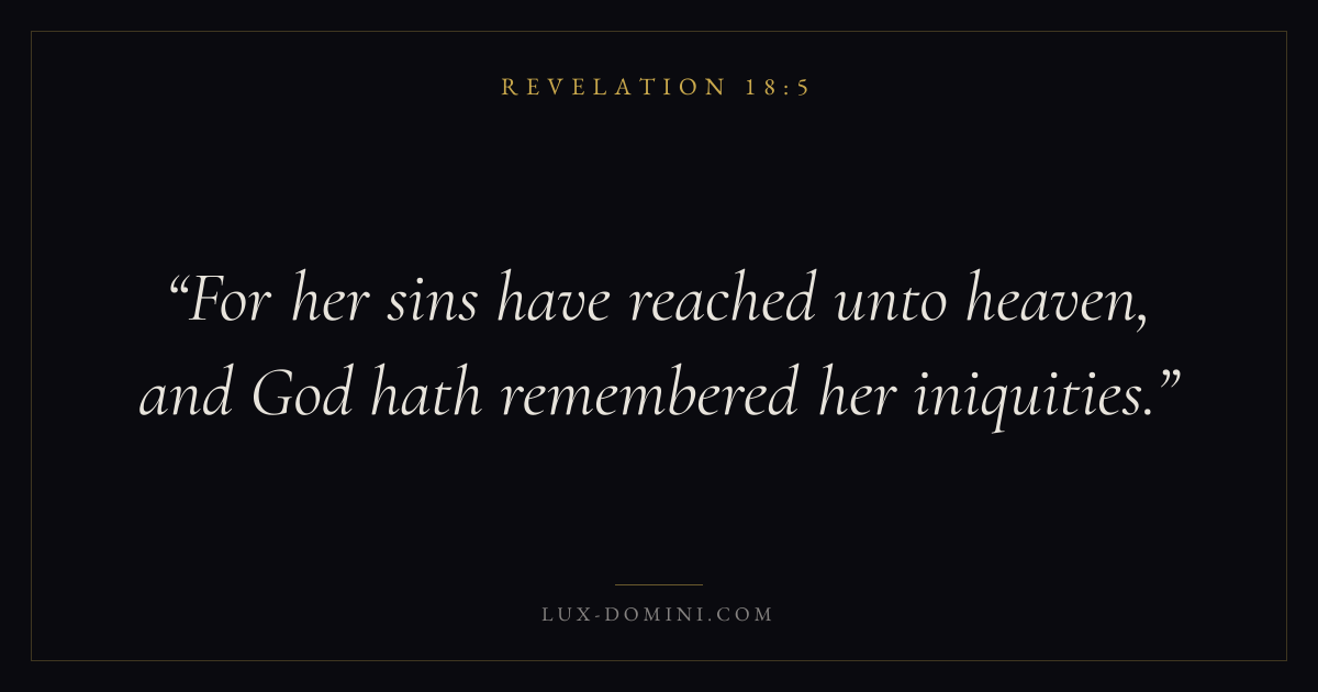 Books / Revelation / Chapter 18 / Verse 5 ← Revelation 18:4 Revelation 18:5 Revelation 18:6 → For her sins have reached unto heaven, and God hath remembered her iniquities. Download verse card Share on Twitter Share on Facebook Pin it ✦ Key themes Justice and mercyTruthWorshipWitness Read with Revelation 18:1Revelation 18:2Micah 6:8Amos 5:24 Related topics Bible verses about justice and mercyBible verses about truthBible verses about worship ✦ Revelation Chapter 18 verses V. 1 V. 2 V. 3 V. 4 V. 5 V. 6 V. 7 V. 8 V. 9 V. 10 V. 11 V. 12 V. 13 V. 14 V. 15 V. 16 V. 17 V. 18 V. 19 V. 20 V. 21 V. 22 V. 23 V. 24