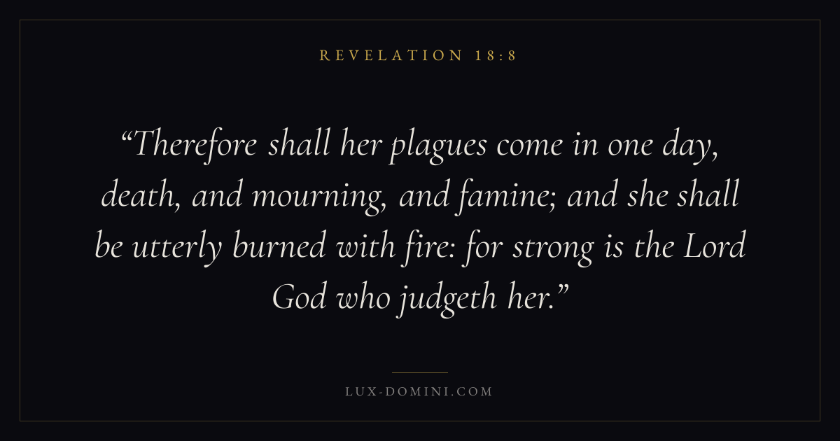 Therefore shall her plagues come in one day, death, and mourning, and famine; and she shall be utterly burned with fire: for strong is the Lord God who judgeth her.