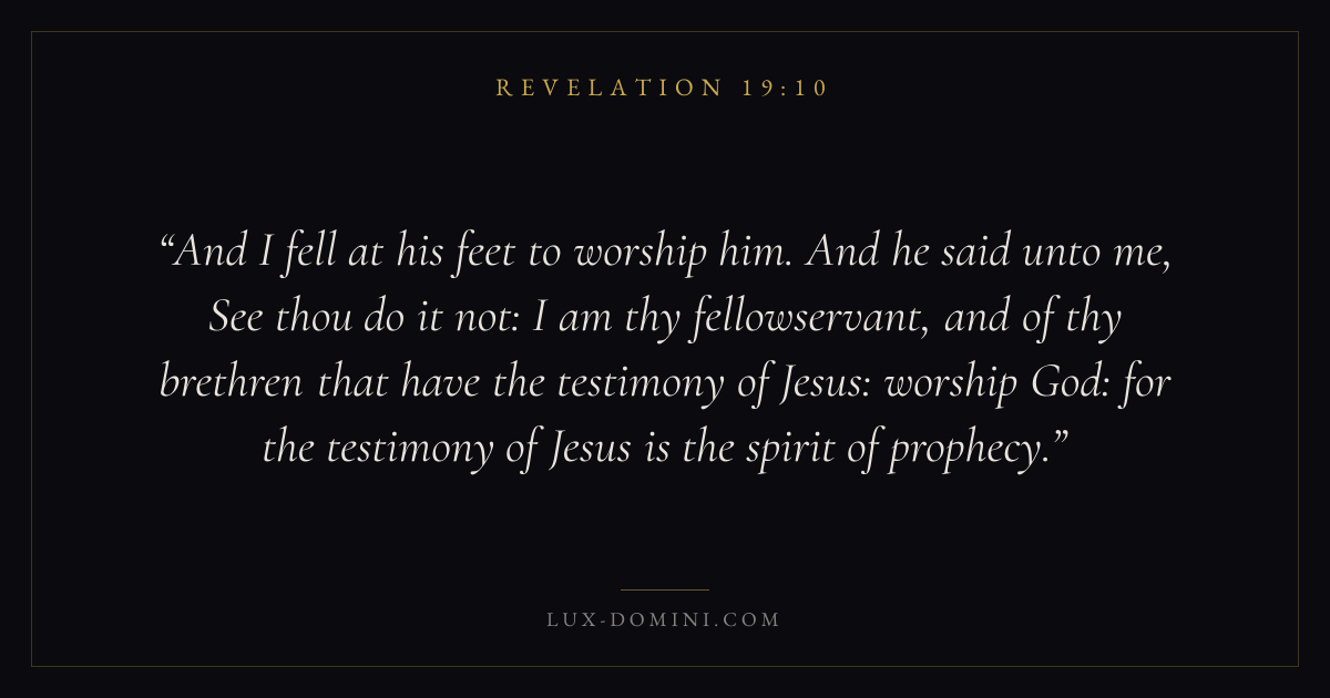 And I fell at his feet to worship him. And he said unto me, See thou do it not: I am thy fellowservant, and of thy brethren that have the testimony of Jesus: worship God: for the testimony of Jesus is the spirit of prophecy.