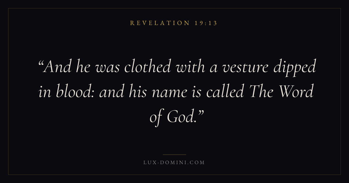 Books / Revelation / Chapter 19 / Verse 13 ← Revelation 19:12 Revelation 19:13 Revelation 19:14 → And he was clothed with a vesture dipped in blood: and his name is called The Word of God. Download verse card Share on Twitter Share on Facebook Pin it ✦ Key themes Justice and mercyTruthWorshipWitness Read with Revelation 19:12Revelation 19:14Micah 6:8Amos 5:24 Related topics Bible verses about justice and mercyBible verses about truthBible verses about worship ✦ Revelation Chapter 19 verses V. 1 V. 2 V. 3 V. 4 V. 5 V. 6 V. 7 V. 8 V. 9 V. 10 V. 11 V. 12 V. 13 V. 14 V. 15 V. 16 V. 17 V. 18 V. 19 V. 20 V. 21