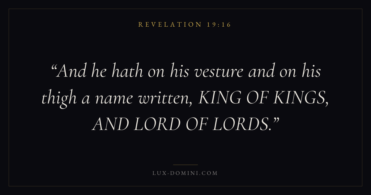 Books / Revelation / Chapter 19 / Verse 16 ← Revelation 19:15 Revelation 19:16 Revelation 19:17 → And he hath on his vesture and on his thigh a name written, KING OF KINGS, AND LORD OF LORDS. Download verse card Share on Twitter Share on Facebook Pin it ✦ Key themes Justice and mercyTruthWorshipWitness Read with Revelation 19:12Revelation 19:13Micah 6:8Amos 5:24 Related topics Bible verses about justice and mercyBible verses about truthBible verses about worship ✦ Revelation Chapter 19 verses V. 1 V. 2 V. 3 V. 4 V. 5 V. 6 V. 7 V. 8 V. 9 V. 10 V. 11 V. 12 V. 13 V. 14 V. 15 V. 16 V. 17 V. 18 V. 19 V. 20 V. 21