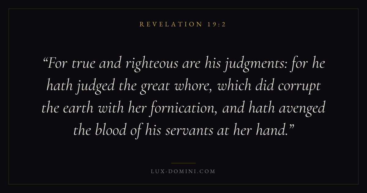 For true and righteous are his judgments: for he hath judged the great whore, which did corrupt the earth with her fornication, and hath avenged the blood of his servants at her hand.