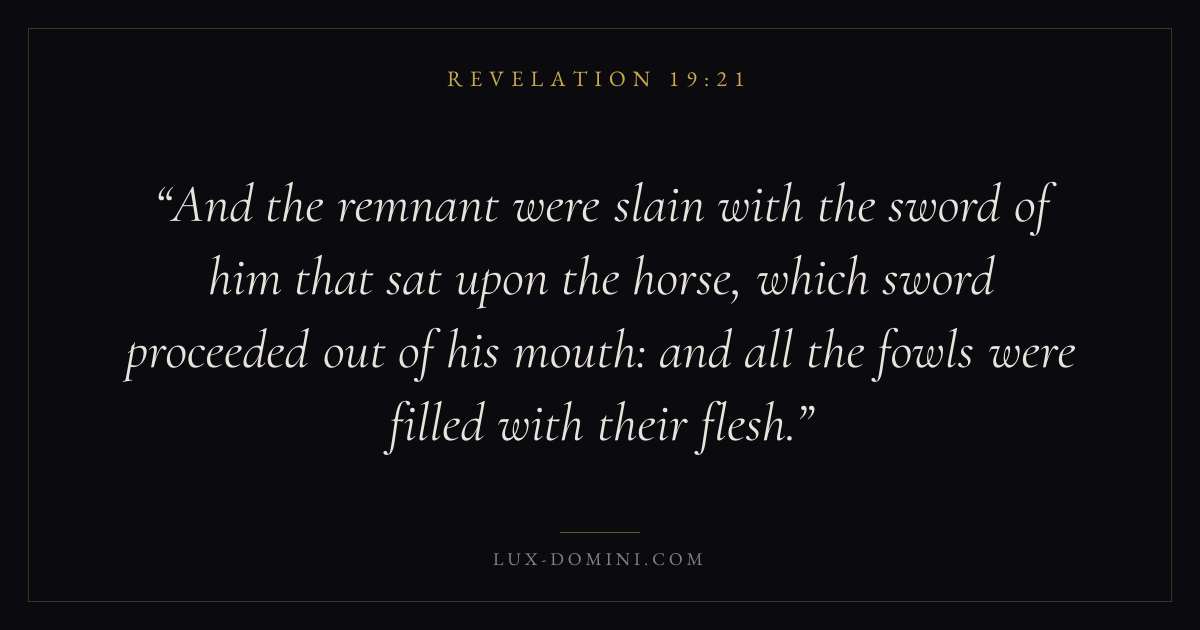 And the remnant were slain with the sword of him that sat upon the horse, which sword proceeded out of his mouth: and all the fowls were filled with their flesh.