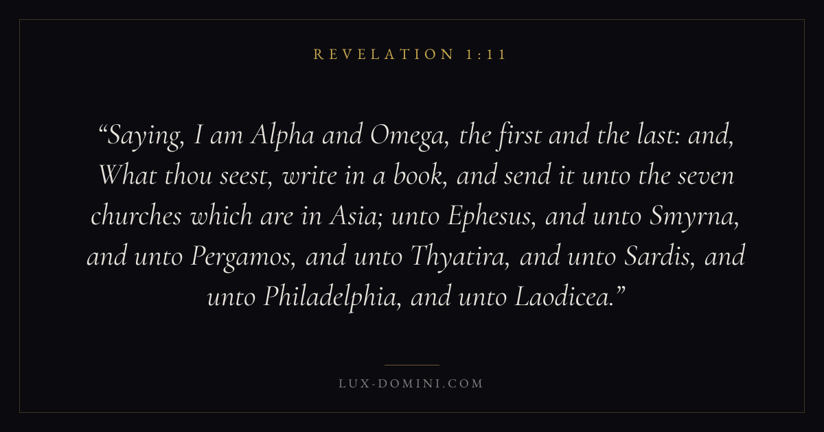 Saying, I am Alpha and Omega, the first and the last: and, What thou seest, write in a book, and send it unto the seven churches which are in Asia; unto Ephesus, and unto Smyrna, and unto Pergamos, and unto Thyatira, and unto Sardis, and unto Philadelphia, and unto Laodicea.