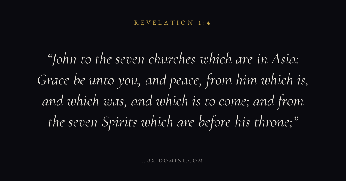 John to the seven churches which are in Asia: Grace be unto you, and peace, from him which is, and which was, and which is to come; and from the seven Spirits which are before his throne;