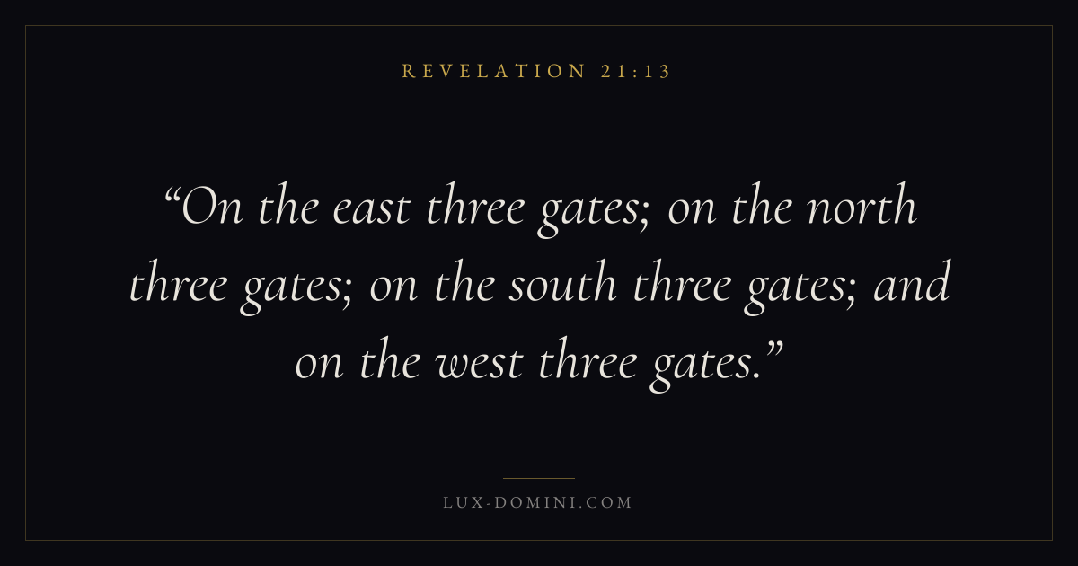 On the east three gates; on the north three gates; on the south three gates; and on the west three gates.