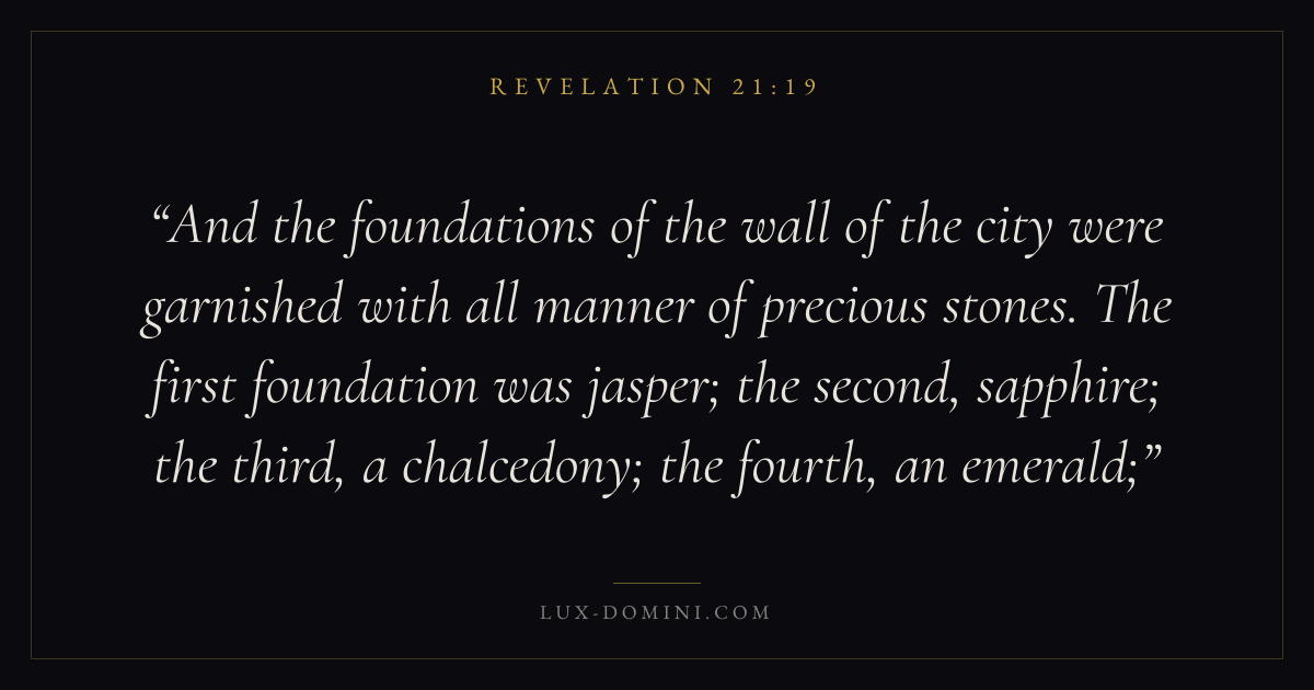 And the foundations of the wall of the city were garnished with all manner of precious stones. The first foundation was jasper; the second, sapphire; the third, a chalcedony; the fourth, an emerald;