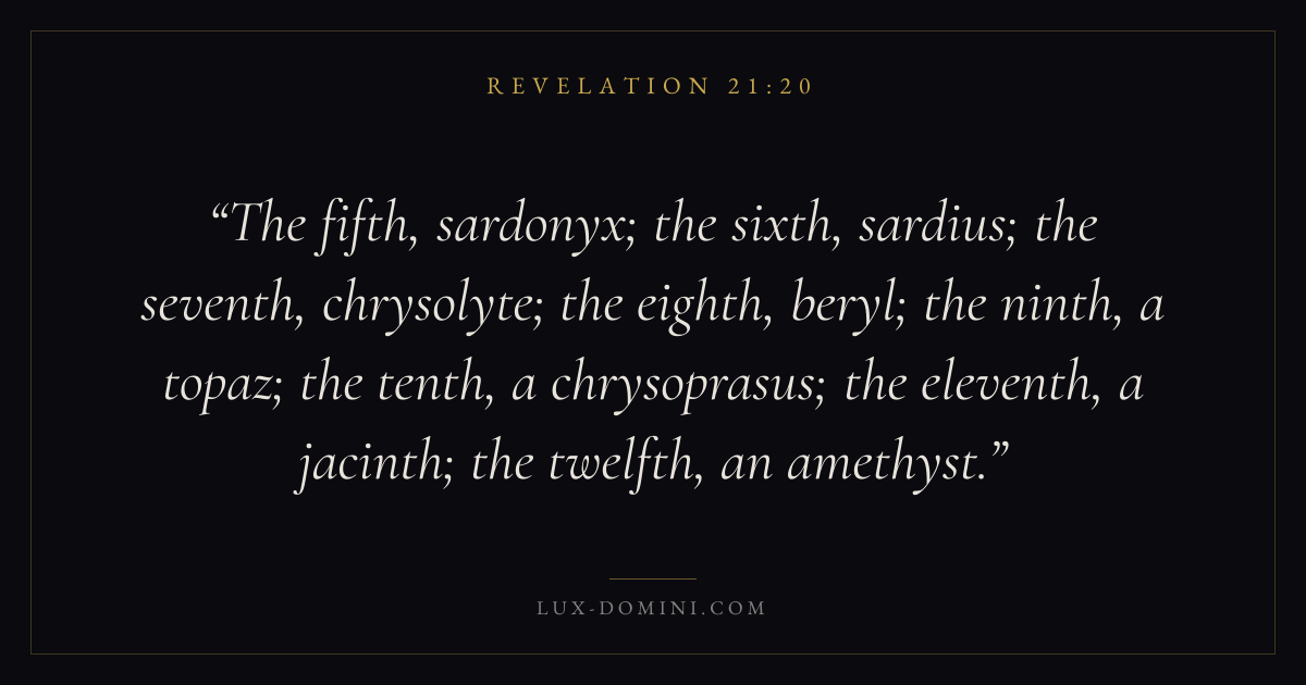 The fifth, sardonyx; the sixth, sardius; the seventh, chrysolyte; the eighth, beryl; the ninth, a topaz; the tenth, a chrysoprasus; the eleventh, a jacinth; the twelfth, an amethyst.