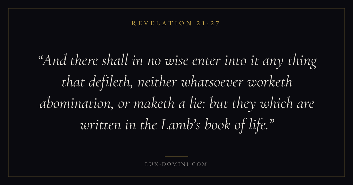 And there shall in no wise enter into it any thing that defileth, neither whatsoever worketh abomination, or maketh a lie: but they which are written in the Lamb’s book of life.
