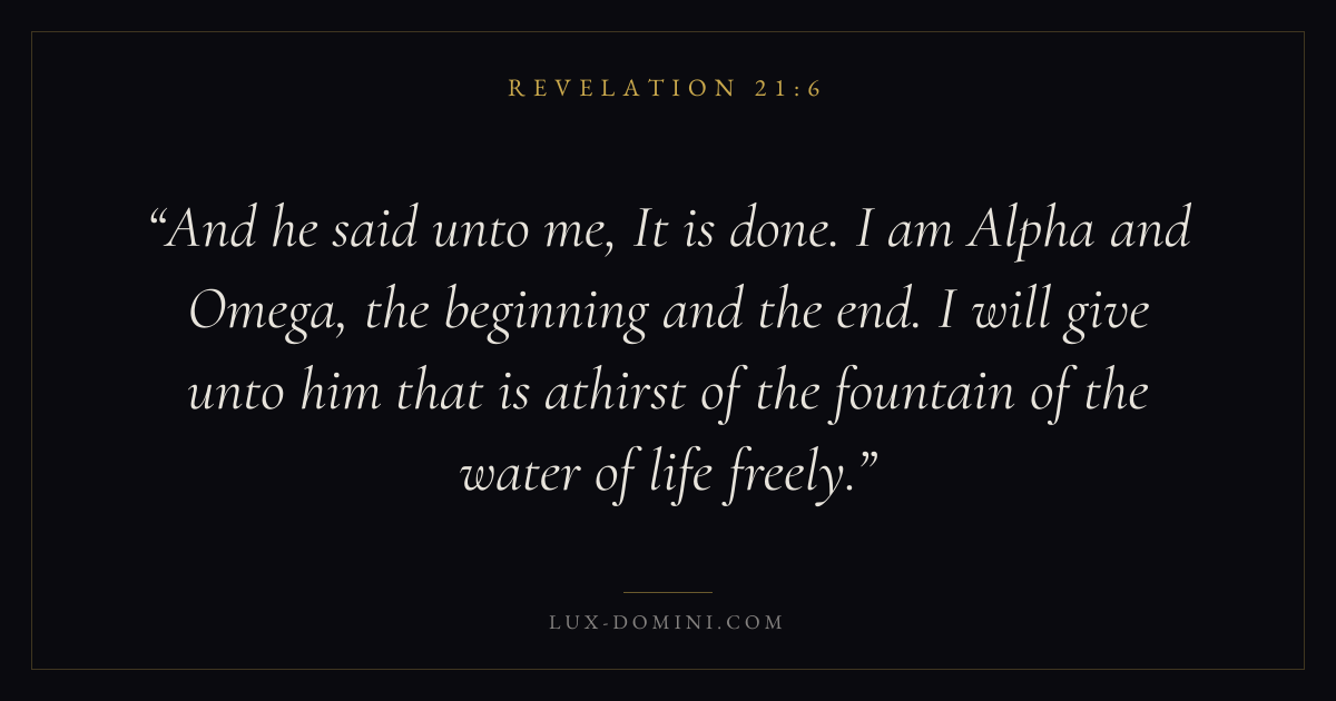 And he said unto me, It is done. I am Alpha and Omega, the beginning and the end. I will give unto him that is athirst of the fountain of the water of life freely.