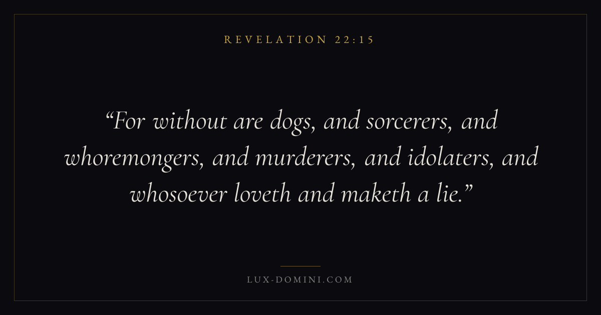 For without are dogs, and sorcerers, and whoremongers, and murderers, and idolaters, and whosoever loveth and maketh a lie.