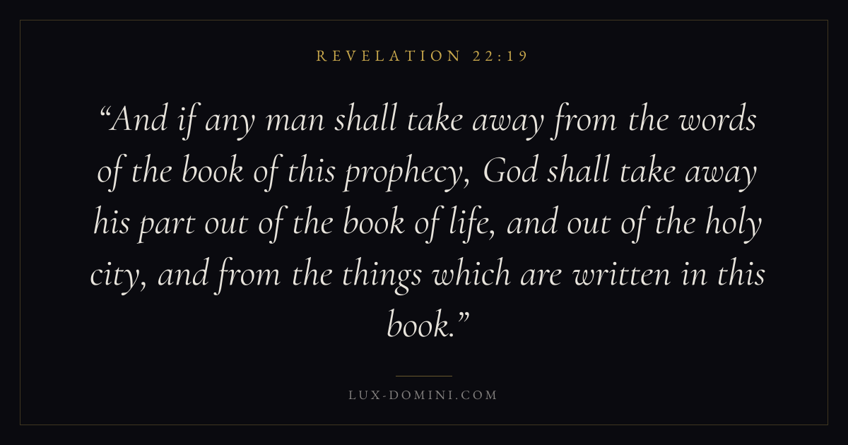And if any man shall take away from the words of the book of this prophecy, God shall take away his part out of the book of life, and out of the holy city, and from the things which are written in this book.