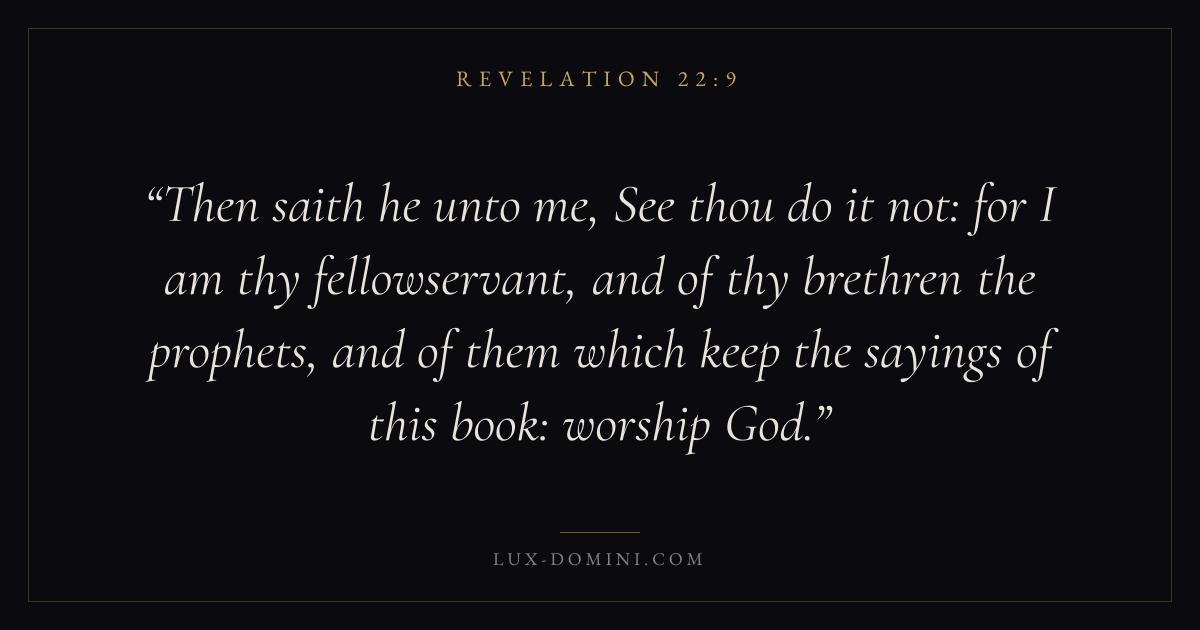 Then saith he unto me, See thou do it not: for I am thy fellowservant, and of thy brethren the prophets, and of them which keep the sayings of this book: worship God.