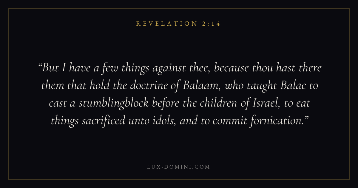 But I have a few things against thee, because thou hast there them that hold the doctrine of Balaam, who taught Balac to cast a stumblingblock before the children of Israel, to eat things sacrificed unto idols, and to commit fornication.