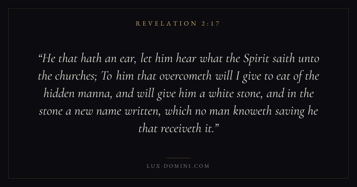 He that hath an ear, let him hear what the Spirit saith unto the churches; To him that overcometh will I give to eat of the hidden manna, and will give him a white stone, and in the stone a new name written, which no man knoweth saving he that receiveth it.