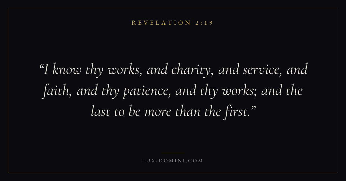 I know thy works, and charity, and service, and faith, and thy patience, and thy works; and the last to be more than the first.