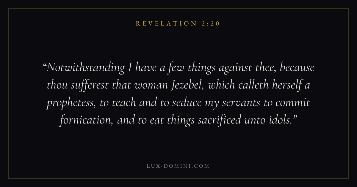Notwithstanding I have a few things against thee, because thou sufferest that woman Jezebel, which calleth herself a prophetess, to teach and to seduce my servants to commit fornication, and to eat things sacrificed unto idols.