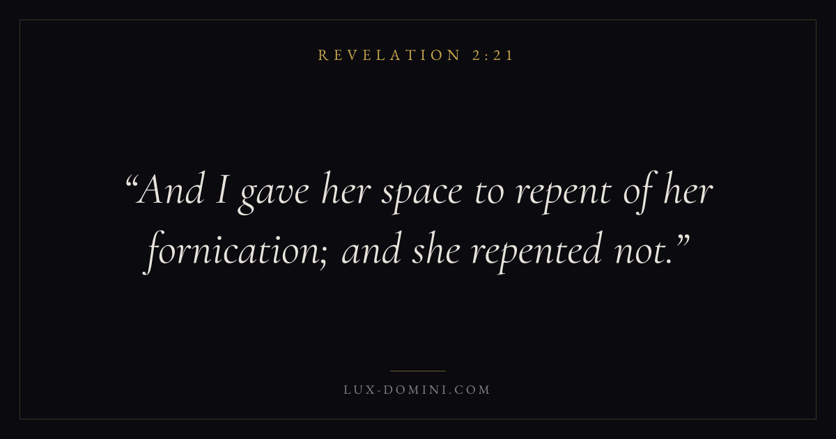 Books / Revelation / Chapter 2 / Verse 21 ← Revelation 2:20 Revelation 2:21 Revelation 2:22 → And I gave her space to repent of her fornication; and she repented not. Download verse card Share on Twitter Share on Facebook Pin it ✦ Key themes LoveFaithJustice and mercyTruthWorship Read with Revelation 2:20John 3:161 Corinthians 13:4Hebrews 11:1 Related topics Bible verses about loveBible verses about faithBible verses about justice and mercyBible verses about truthBible verses about worship ✦ Revelation Chapter 2 verses V. 1 V. 2 V. 3 V. 4 V. 5 V. 6 V. 7 V. 8 V. 9 V. 10 V. 11 V. 12 V. 13 V. 14 V. 15 V. 16 V. 17 V. 18 V. 19 V. 20 V. 21 V. 22 V. 23 V. 24 V. 25 V. 26 V. 27 V. 28 V. 29