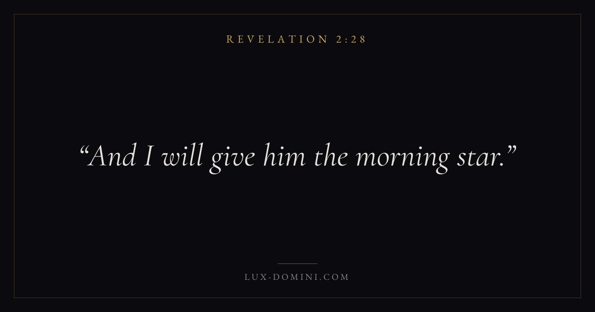 Books / Revelation / Chapter 2 / Verse 28 ← Revelation 2:27 Revelation 2:28 Revelation 2:29 → And I will give him the morning star. Download verse card Share on Twitter Share on Facebook Pin it ✦ Key themes LoveFaithJustice and mercyTruthWorship Read with Revelation 2:27Revelation 2:29John 3:161 Corinthians 13:4 Related topics Bible verses about loveBible verses about faithBible verses about justice and mercyBible verses about truthBible verses about worship ✦ Revelation Chapter 2 verses V. 1 V. 2 V. 3 V. 4 V. 5 V. 6 V. 7 V. 8 V. 9 V. 10 V. 11 V. 12 V. 13 V. 14 V. 15 V. 16 V. 17 V. 18 V. 19 V. 20 V. 21 V. 22 V. 23 V. 24 V. 25 V. 26 V. 27 V. 28 V. 29