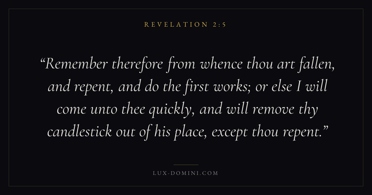 Remember therefore from whence thou art fallen, and repent, and do the first works; or else I will come unto thee quickly, and will remove thy candlestick out of his place, except thou repent.