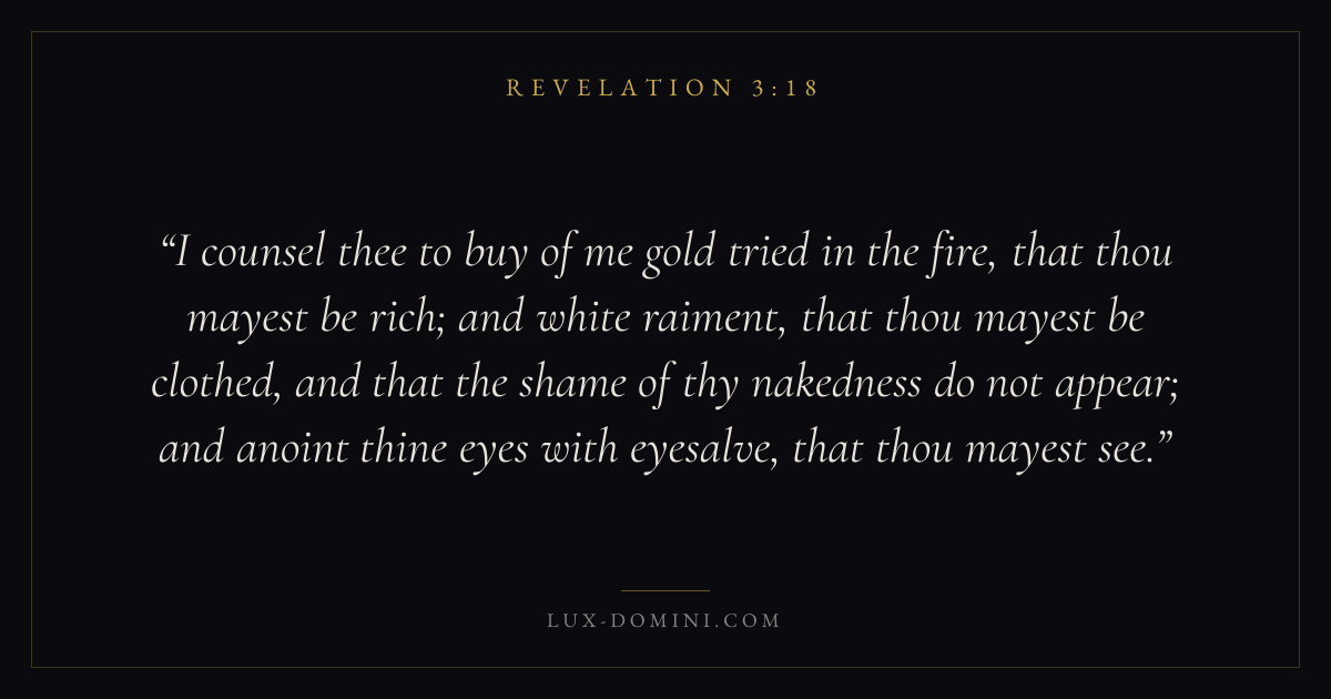 I counsel thee to buy of me gold tried in the fire, that thou mayest be rich; and white raiment, that thou mayest be clothed, and that the shame of thy nakedness do not appear; and anoint thine eyes with eyesalve, that thou mayest see.