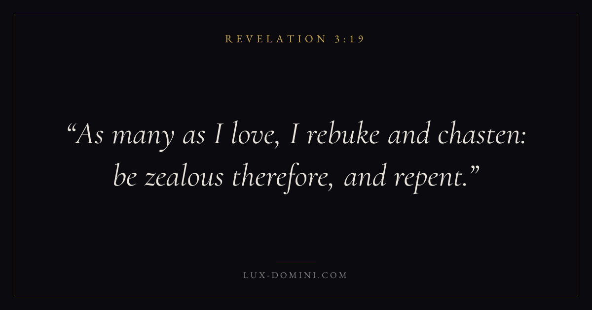 Books / Revelation / Chapter 3 / Verse 19 ← Revelation 3:18 Revelation 3:19 Revelation 3:20 → As many as I love, I rebuke and chasten: be zealous therefore, and repent. Download verse card Share on Twitter Share on Facebook Pin it ✦ Key themes LoveJustice and mercyTruthWorship Read with Revelation 3:20John 3:161 Corinthians 13:4Micah 6:8 Related topics Bible verses about loveBible verses about justice and mercyBible verses about truthBible verses about worship ✦ Revelation Chapter 3 verses V. 1 V. 2 V. 3 V. 4 V. 5 V. 6 V. 7 V. 8 V. 9 V. 10 V. 11 V. 12 V. 13 V. 14 V. 15 V. 16 V. 17 V. 18 V. 19 V. 20 V. 21 V. 22