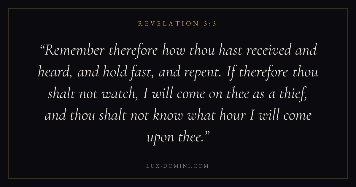 Remember therefore how thou hast received and heard, and hold fast, and repent. If therefore thou shalt not watch, I will come on thee as a thief, and thou shalt not know what hour I will come upon thee.