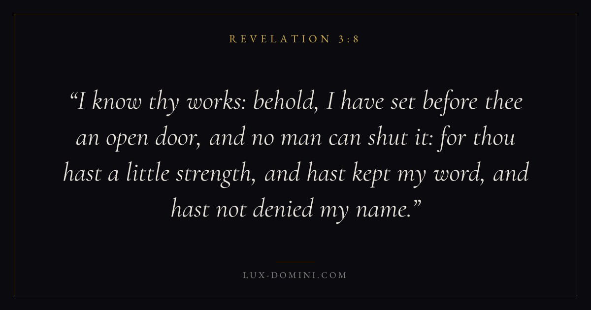 I know thy works: behold, I have set before thee an open door, and no man can shut it: for thou hast a little strength, and hast kept my word, and hast not denied my name.