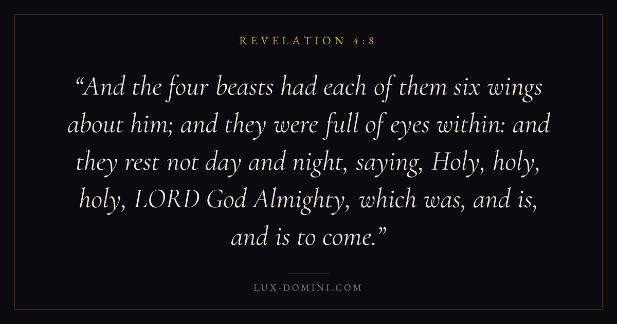 And the four beasts had each of them six wings about him; and they were full of eyes within: and they rest not day and night, saying, Holy, holy, holy, LORD God Almighty, which was, and is, and is to come.