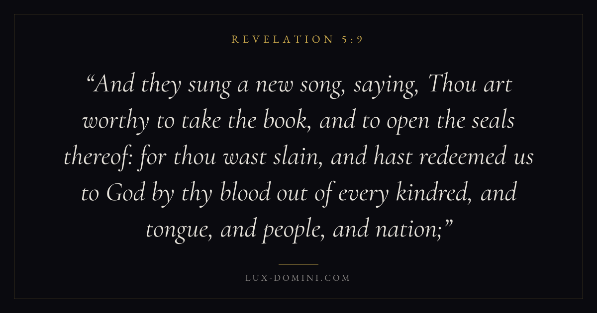 And they sung a new song, saying, Thou art worthy to take the book, and to open the seals thereof: for thou wast slain, and hast redeemed us to God by thy blood out of every kindred, and tongue, and people, and nation;