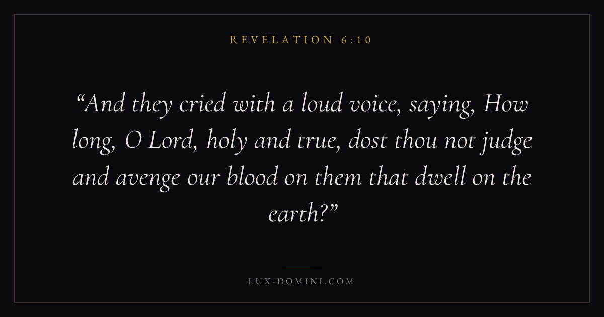 And they cried with a loud voice, saying, How long, O Lord, holy and true, dost thou not judge and avenge our blood on them that dwell on the earth?