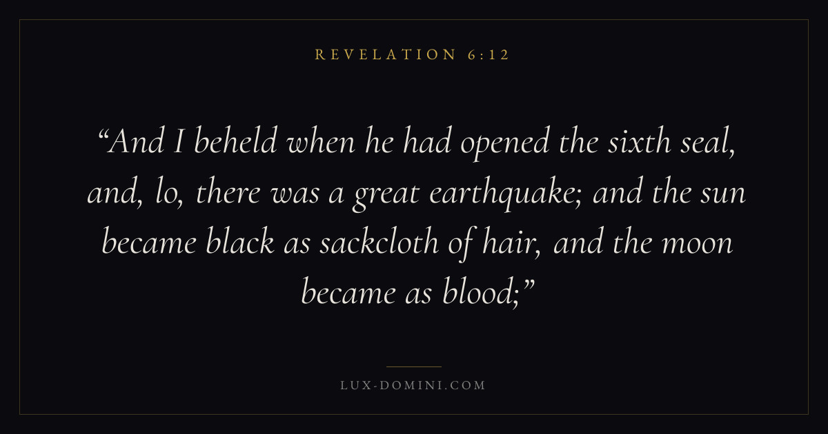 And I beheld when he had opened the sixth seal, and, lo, there was a great earthquake; and the sun became black as sackcloth of hair, and the moon became as blood;