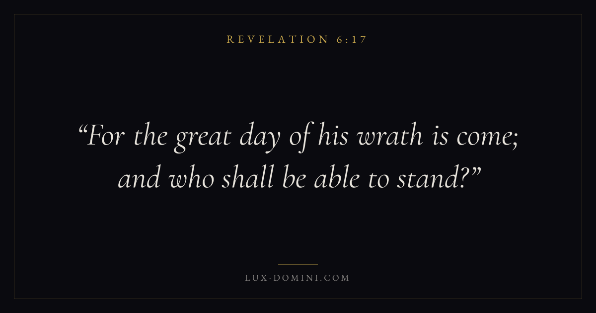 Books / Revelation / Chapter 6 / Verse 17 ← Revelation 6:16 Revelation 6:17 Revelation 7:1 → For the great day of his wrath is come; and who shall be able to stand? Download verse card Share on Twitter Share on Facebook Pin it ✦ Key themes Justice and mercyTruthWorshipWitness Read with Revelation 6:16Micah 6:8Amos 5:24John 14:6 Related topics Bible verses about justice and mercyBible verses about truthBible verses about worship ✦ Revelation Chapter 6 verses V. 1 V. 2 V. 3 V. 4 V. 5 V. 6 V. 7 V. 8 V. 9 V. 10 V. 11 V. 12 V. 13 V. 14 V. 15 V. 16 V. 17