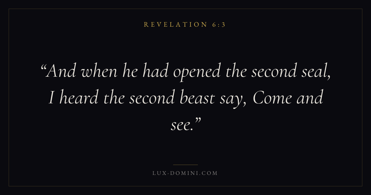 Books / Revelation / Chapter 6 / Verse 3 ← Revelation 6:2 Revelation 6:3 Revelation 6:4 → And when he had opened the second seal, I heard the second beast say, Come and see. Download verse card Share on Twitter Share on Facebook Pin it ✦ Key themes Justice and mercyTruthWorshipWitness Read with Revelation 6:1Revelation 6:2Micah 6:8Amos 5:24 Related topics Bible verses about justice and mercyBible verses about truthBible verses about worship ✦ Revelation Chapter 6 verses V. 1 V. 2 V. 3 V. 4 V. 5 V. 6 V. 7 V. 8 V. 9 V. 10 V. 11 V. 12 V. 13 V. 14 V. 15 V. 16 V. 17