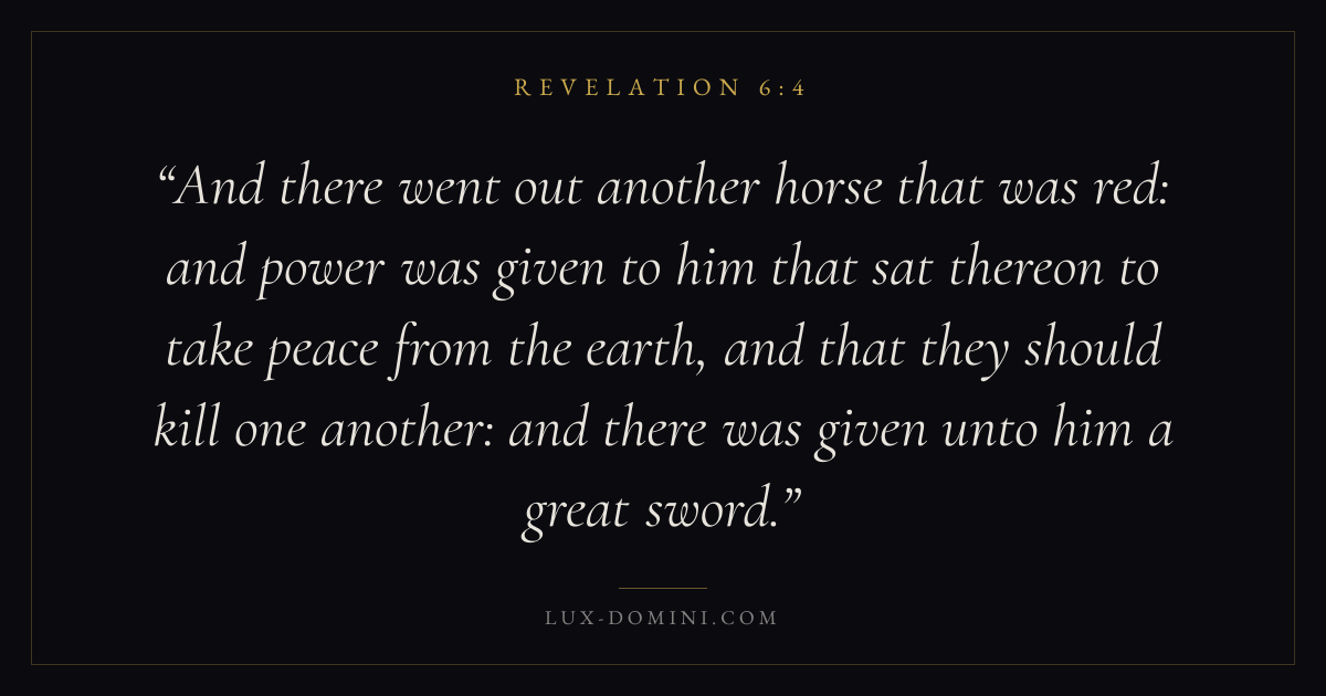 And there went out another horse that was red: and power was given to him that sat thereon to take peace from the earth, and that they should kill one another: and there was given unto him a great sword.