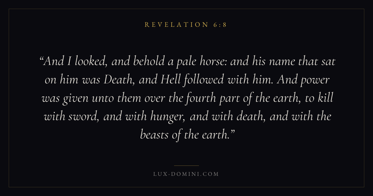 And I looked, and behold a pale horse: and his name that sat on him was Death, and Hell followed with him. And power was given unto them over the fourth part of the earth, to kill with sword, and with hunger, and with death, and with the beasts of the earth.