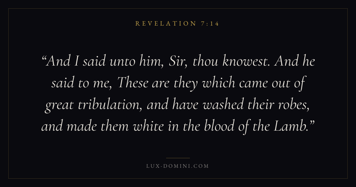 And I said unto him, Sir, thou knowest. And he said to me, These are they which came out of great tribulation, and have washed their robes, and made them white in the blood of the Lamb.