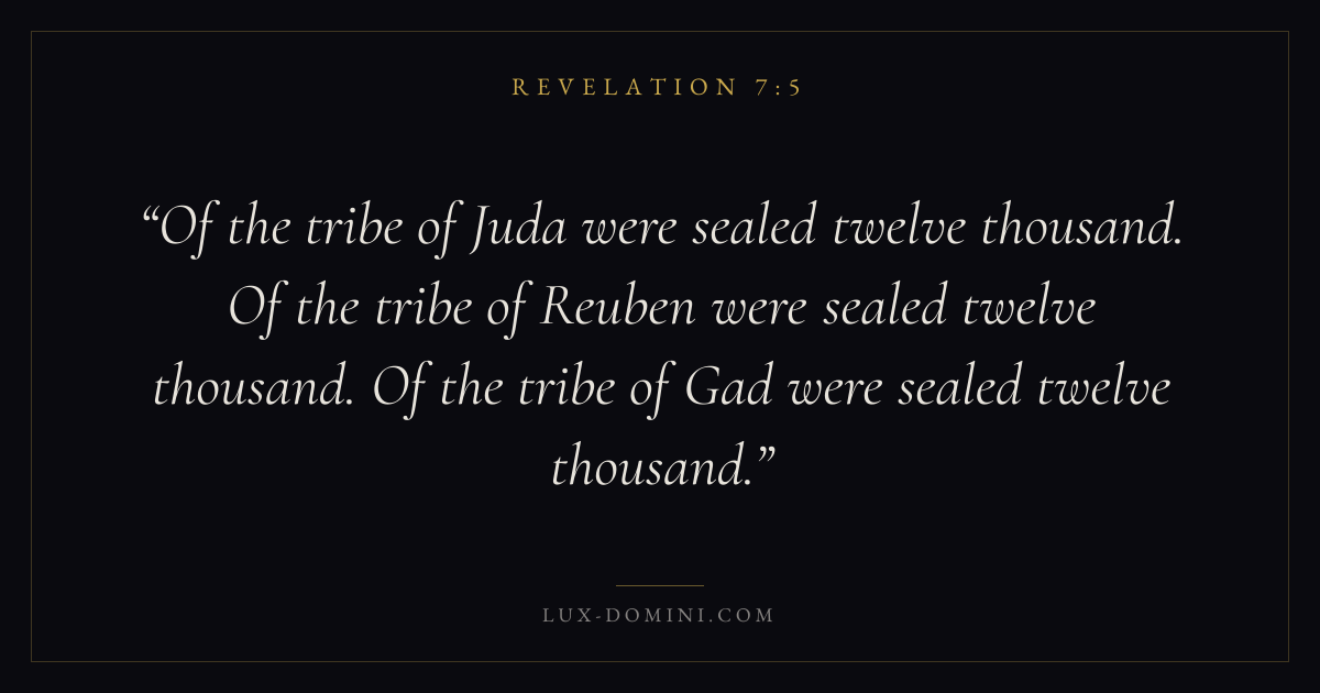 Of the tribe of Juda were sealed twelve thousand. Of the tribe of Reuben were sealed twelve thousand. Of the tribe of Gad were sealed twelve thousand.