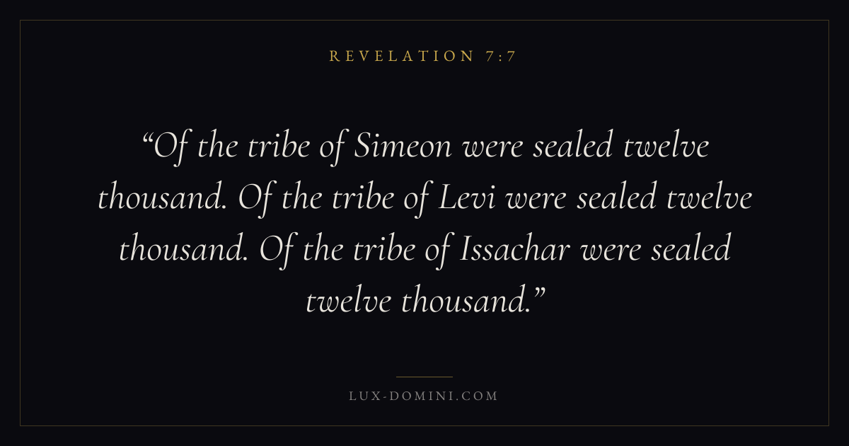 Of the tribe of Simeon were sealed twelve thousand. Of the tribe of Levi were sealed twelve thousand. Of the tribe of Issachar were sealed twelve thousand.