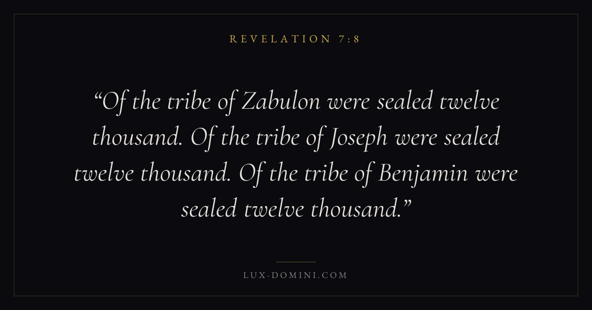 Of the tribe of Zabulon were sealed twelve thousand. Of the tribe of Joseph were sealed twelve thousand. Of the tribe of Benjamin were sealed twelve thousand.