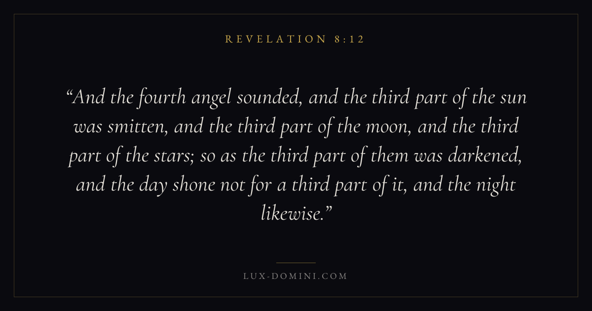 And the fourth angel sounded, and the third part of the sun was smitten, and the third part of the moon, and the third part of the stars; so as the third part of them was darkened, and the day shone not for a third part of it, and the night likewise.
