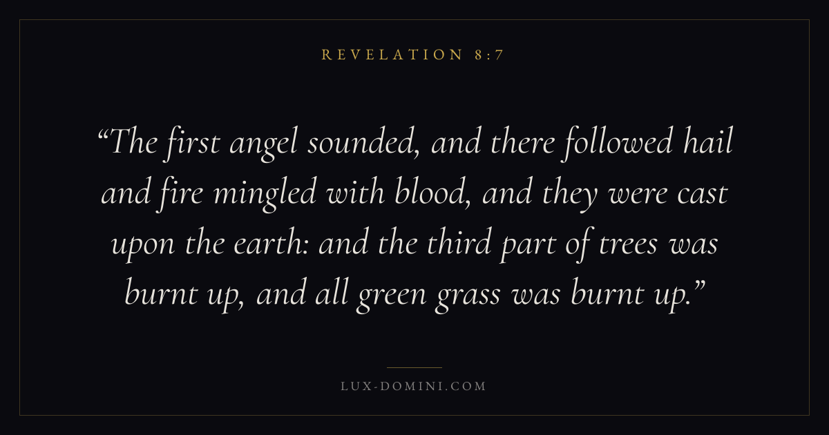 The first angel sounded, and there followed hail and fire mingled with blood, and they were cast upon the earth: and the third part of trees was burnt up, and all green grass was burnt up.