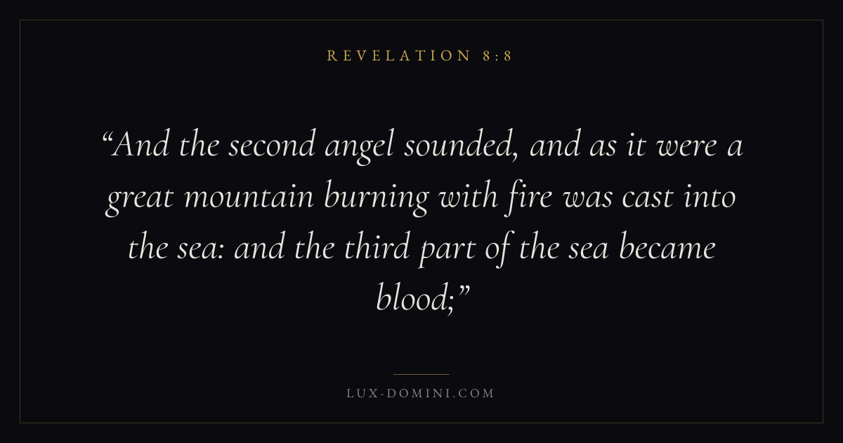 And the second angel sounded, and as it were a great mountain burning with fire was cast into the sea: and the third part of the sea became blood;