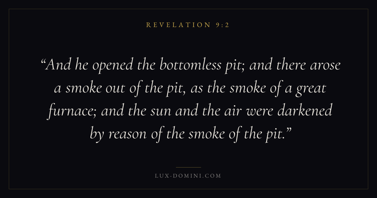 And he opened the bottomless pit; and there arose a smoke out of the pit, as the smoke of a great furnace; and the sun and the air were darkened by reason of the smoke of the pit.