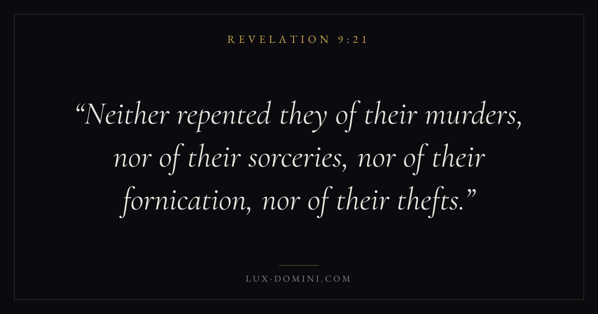 Neither repented they of their murders, nor of their sorceries, nor of their fornication, nor of their thefts.