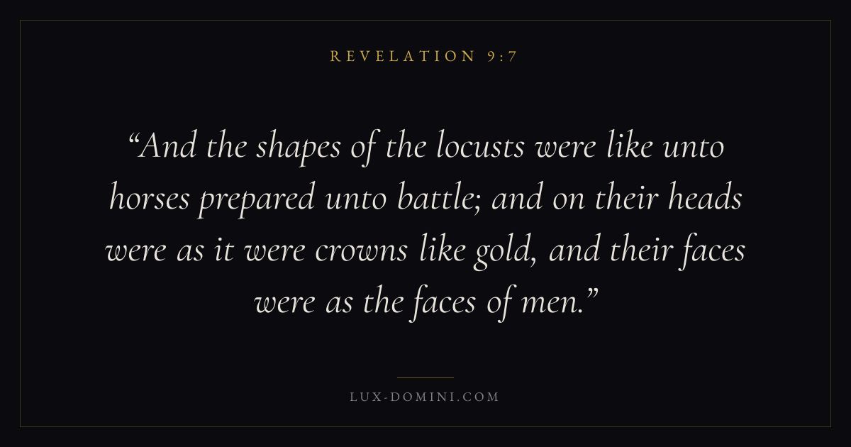 And the shapes of the locusts were like unto horses prepared unto battle; and on their heads were as it were crowns like gold, and their faces were as the faces of men.