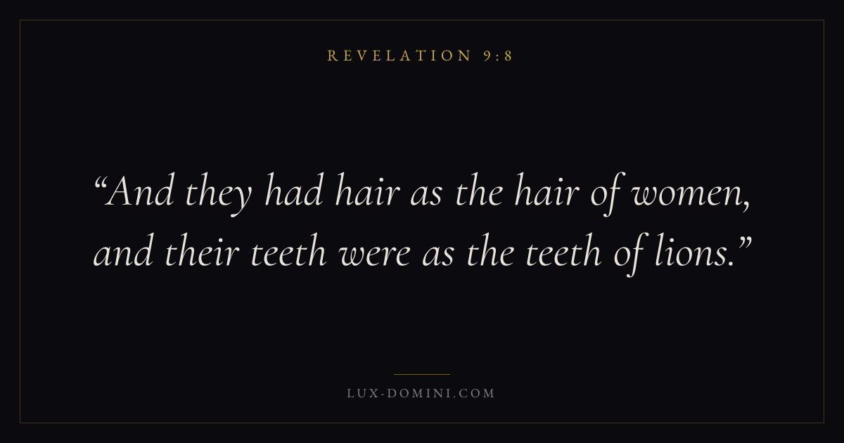 Books / Revelation / Chapter 9 / Verse 8 ← Revelation 9:7 Revelation 9:8 Revelation 9:9 → And they had hair as the hair of women, and their teeth were as the teeth of lions. Download verse card Share on Twitter Share on Facebook Pin it ✦ Key themes Justice and mercyTruthWorshipWitness Read with Revelation 9:6Revelation 9:7Micah 6:8Amos 5:24 Related topics Bible verses about justice and mercyBible verses about truthBible verses about worship ✦ Revelation Chapter 9 verses V. 1 V. 2 V. 3 V. 4 V. 5 V. 6 V. 7 V. 8 V. 9 V. 10 V. 11 V. 12 V. 13 V. 14 V. 15 V. 16 V. 17 V. 18 V. 19 V. 20 V. 21
